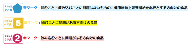 スマイルケア食は以下の3つに分類され、それぞれにマークが表示されています。以下がスマイルケア食の分類とマークの図です。