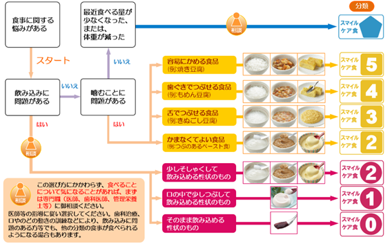 また、以下はスマイルケア食の適切な選び方を示した図です。質問に答えながら矢印を辿っていくと、対象者に合った食品がわかるようになっています。