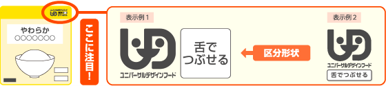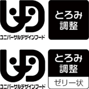 また、それぞれの食品にはユニバーサルデザインフードマークが、とろみ調整食品にはとろみ調整食品マークが表示されています。