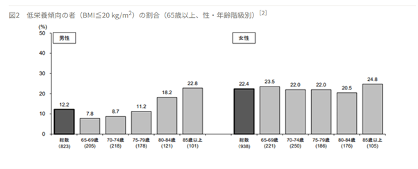 結果、男女ともに85歳以上になると、20%以上の方が低栄養傾向に陥っていることがわかります。