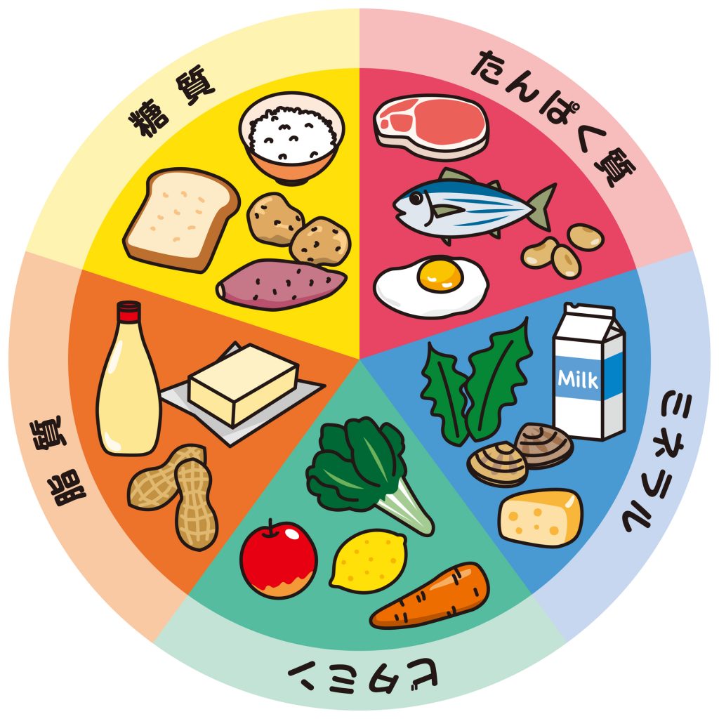 「5色バランス」とは、食べ物の色から栄養バランスを整える方法です。赤色の食べ物(体をつくる)、黄色の食べ物(エネルギー)、緑色の食べ物(体の調子を整える)の3色をベースに、白と黒の食べ物を加えた5色でバランスをとります。この5色の食べ物をバランスよく取り入れることで、自然と多様な栄養素を摂取することができ、見た目にも美しい食事を提供しましょう。