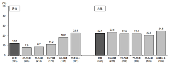 令和5年国民健康・栄養調査では、高齢者(65歳以上)の低栄養傾向の割合は男性12.2%、女性22.4%であることがわかりました。特に男女共に85歳以上で割合が高くなっています